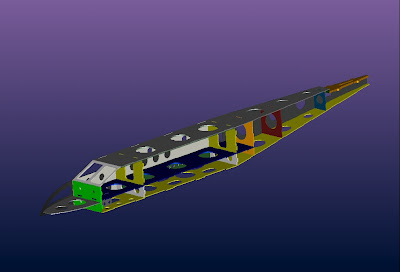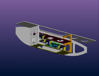 This is the detail design of the fuselage. You'll see all the plates connecting with each other to form the structure of the body. There are some circular holes in these plates to maintain a proper strength/weigth ratio.