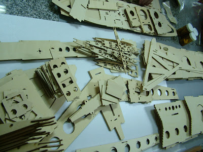 It took me three plus weeks of continuous day-and-night works to complete the deail design of the aircraft. Then, it took another three days of after-hour night working using a Laser cut machine to generate these wood plates by one of my brother's classmates' father. It was an exciting moment when I see these plates coming out from the machine.
